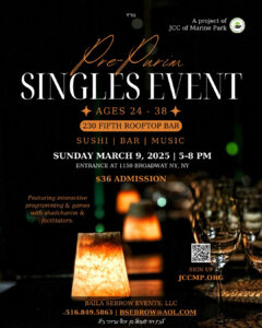 On March 9, over a hundred singles, ages 24-38, will gather at our JCCMP Pre-Purim Singles Event at the Rooftop Bar in Manhattan to mix and mingle and perhaps meet their bashert! Shadchan Baila Sebrow will run the event, which promises to be a blast with interactive programming, games, and speed dating. Shadchanim will be present to help facilitate the event and guide singles with any challenges they may have in socializing.