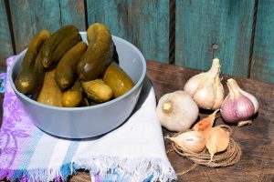 pickles kirby cucumbers garlic homemade shutterstock_1784052872